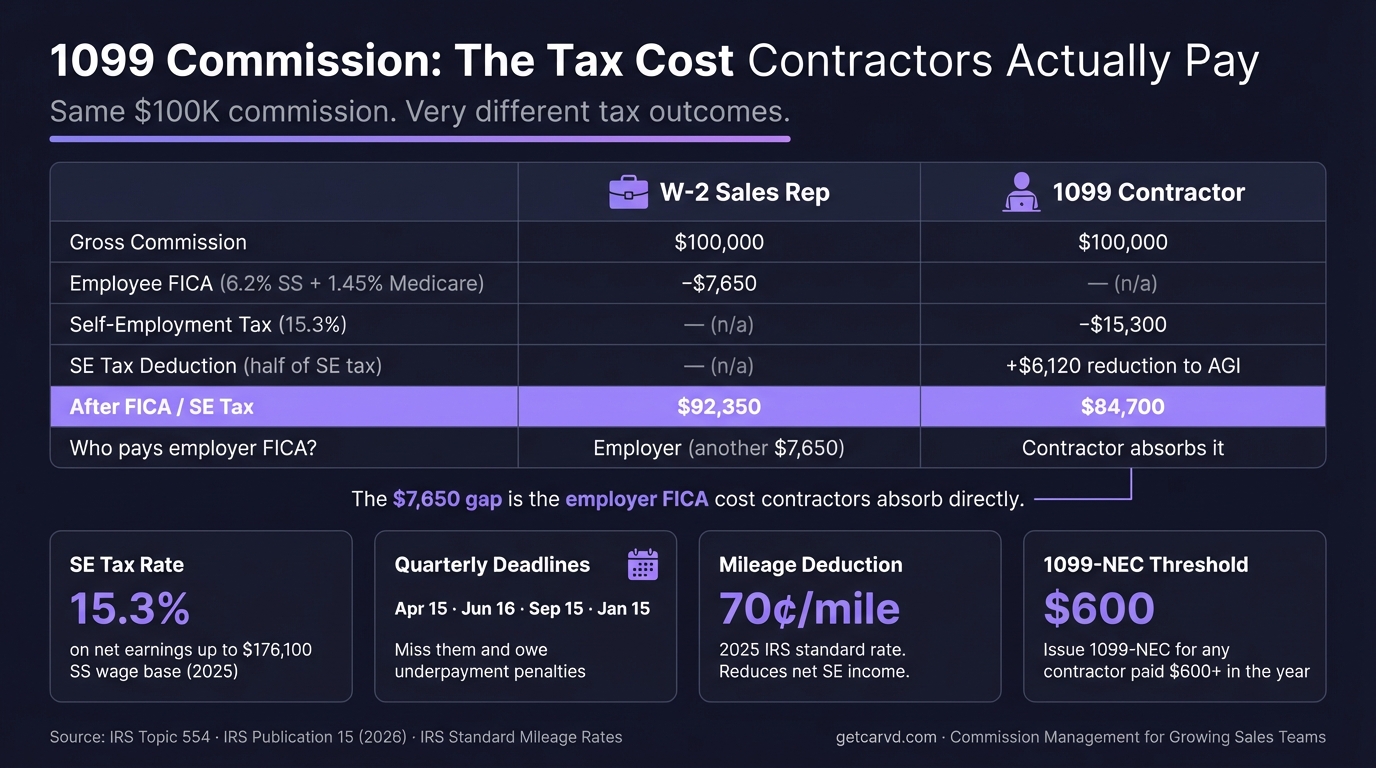 1099 commission contractors receive gross pay with no withholding and owe 15.3% self-employment tax. Here's how contractor comp plans work and what companies need to know.