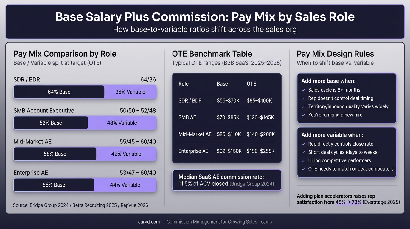 The right base-to-variable split depends on the role, the sales cycle, and what behaviors you want to reinforce. Starting benchmarks: 70/30 for SDRs, 60/40 for SMB AEs, 50/50 for mid-market AEs, and 70/30 to 80/20 for account managers.