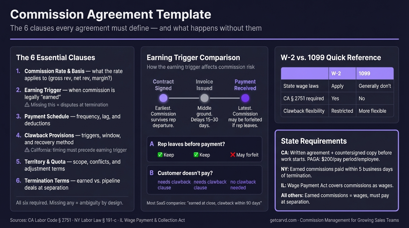 Most of those disputes trace back to the same gaps: no definition of when commission is "earned," vague clawback language, missing post-termination terms. The template below addresses all of them.