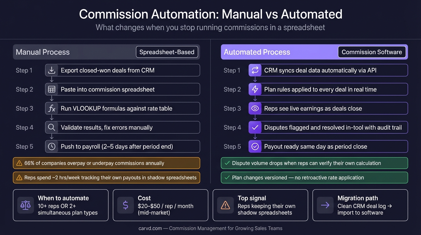 Most teams find the math favors automation somewhere between 10 and 20 reps, assuming the plan has at least moderate complexity (more than a single flat rate). A 5-rep team on a flat-rate plan can run a spreadsheet indefinitely with minimal risk.