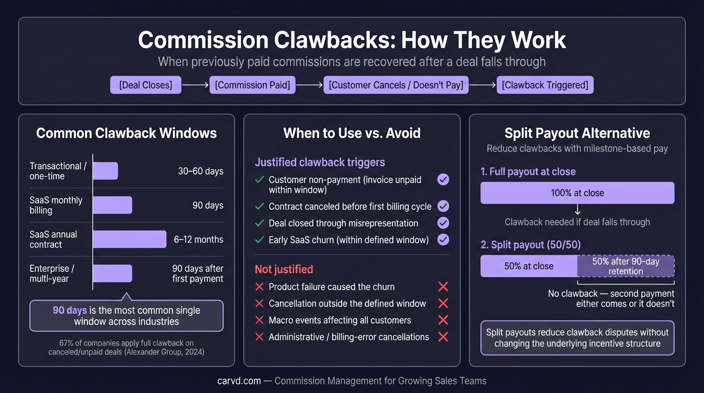 Ninety days is the most common single window across industries. For SaaS companies where customer health only becomes clear over a longer period, extending to 6 months is reasonable — but the longer the window, the more contested specific clawbacks become. Reps who closed a deal eight months ago often have limited recollection of why, which makes disputes harder to resolve.