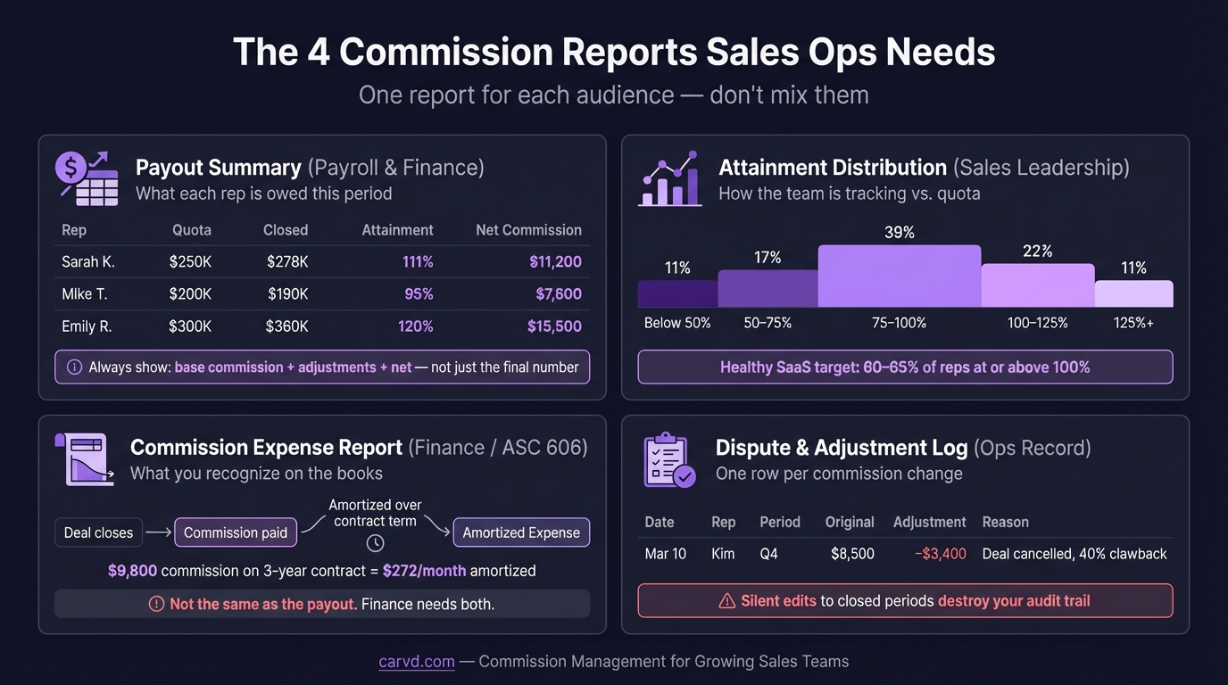Commission reporting goes beyond a payout spreadsheet. Here's what sales ops, finance, and reps each need — and how to build reports that prevent disputes.