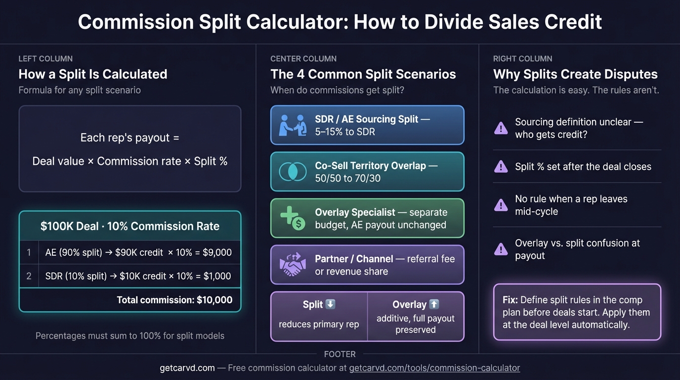 Free commission split calculator for SDR/AE splits, co-sells, and overlay pairings. Includes formulas, common split percentages, and worked examples.