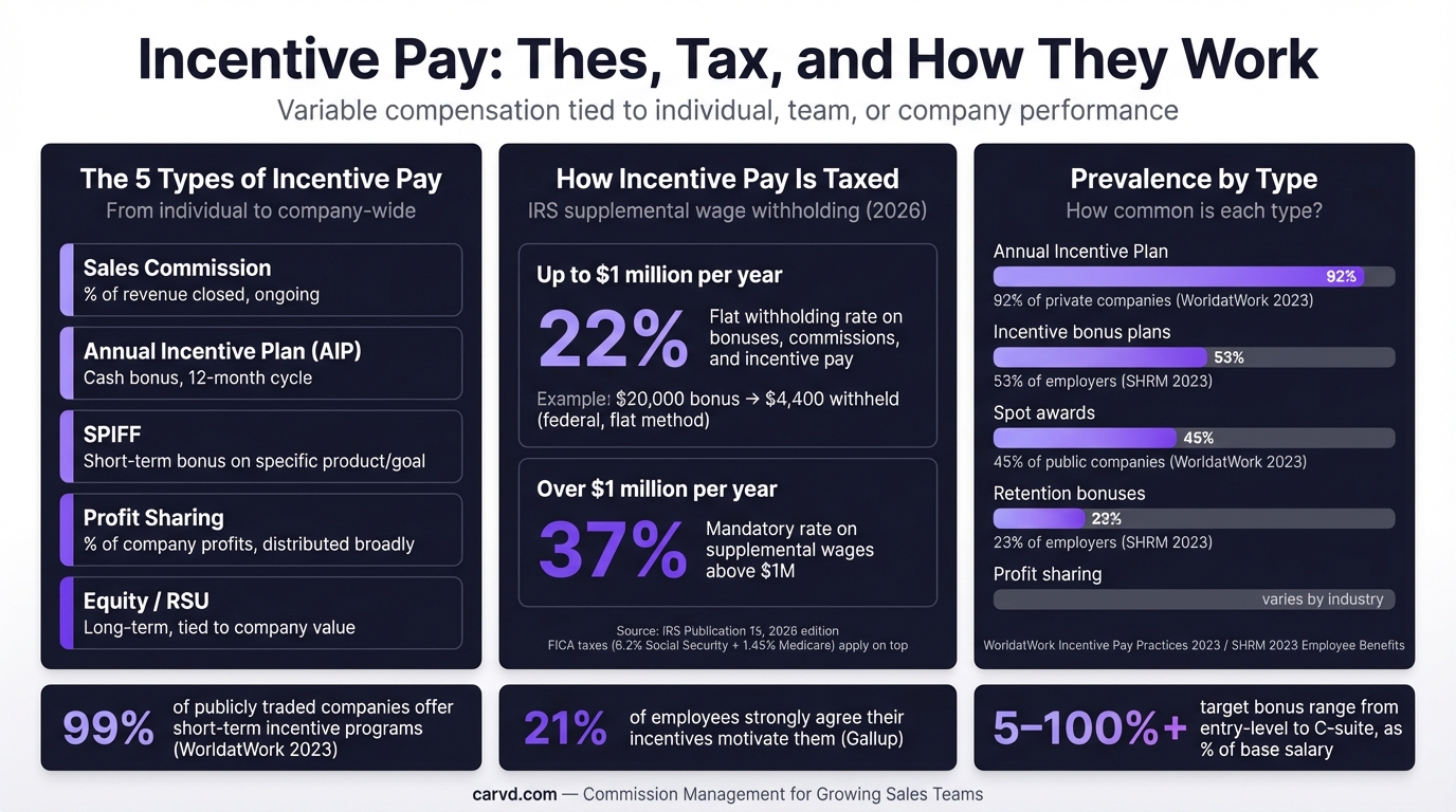 Incentive pay is variable compensation tied to performance — commissions, bonuses, profit sharing, or equity. Here's how each type works and how it's taxed.