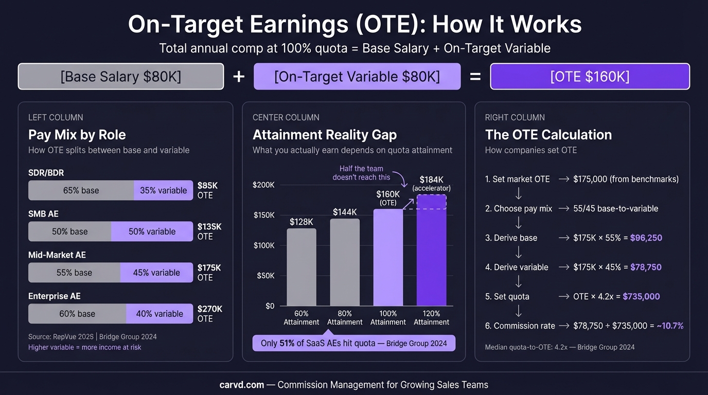 On-target earnings (OTE) is the total annual pay a sales rep earns when hitting exactly 100% of quota. It combines base salary and variable commission into one number — the figure that appears in job postings and offer letters.