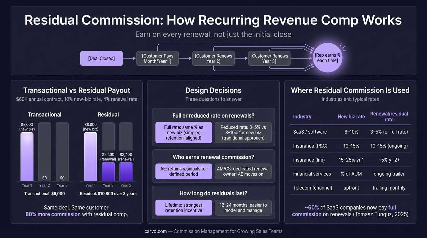Residual commission pays reps on renewals, not just the initial close. Learn how it works, typical rates, common structures, and when it makes sense for SaaS.
