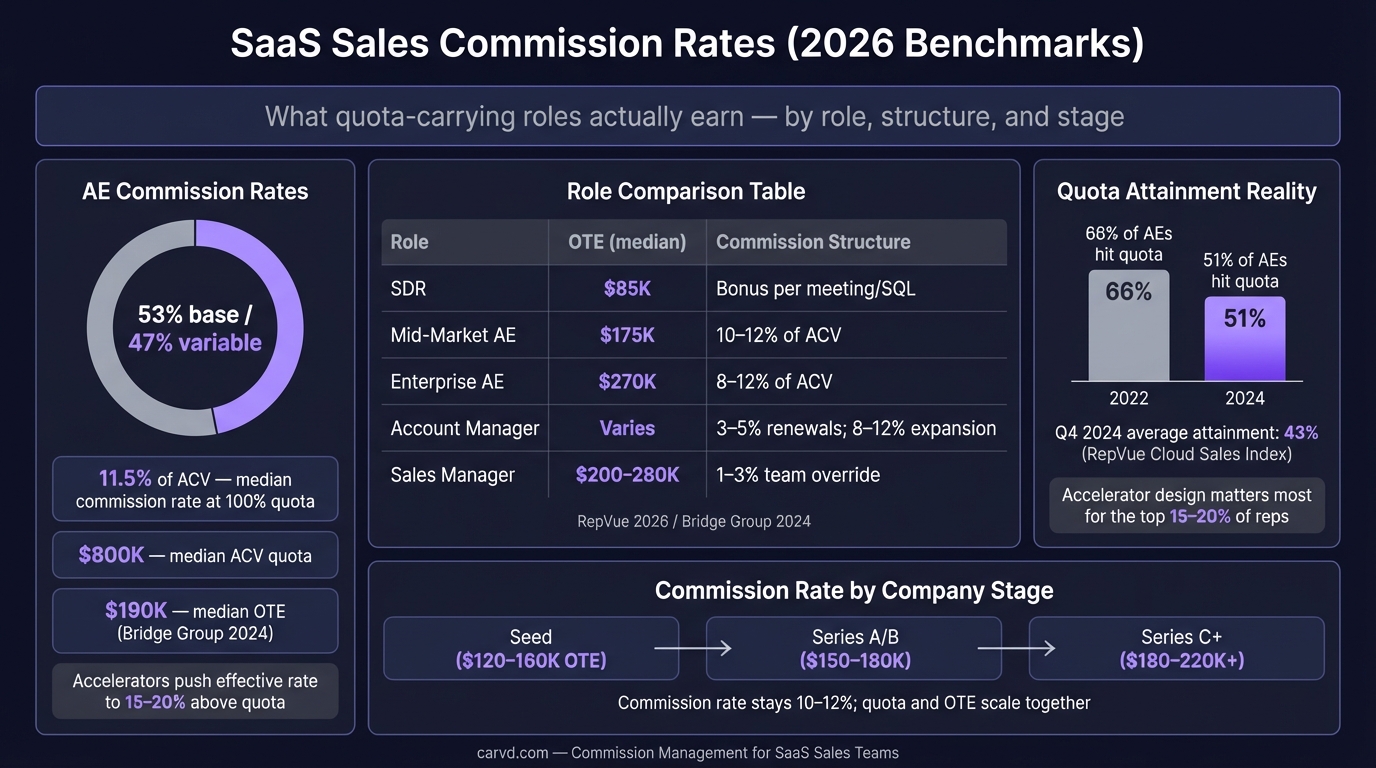 Bridge Group 2024 data: median SaaS AE commission rate is 11.5% of ACV. Here's how rates vary by segment, role, and quota attainment — with verified benchmarks.