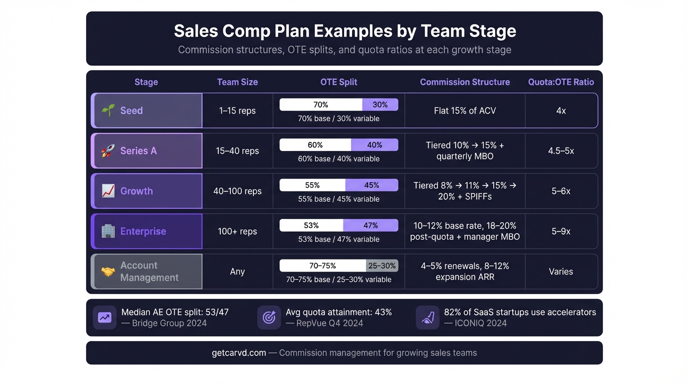 See five real sales comp plan examples with actual OTE splits, commission rates, and quota ratios — from early-stage startups to scaling AE teams.