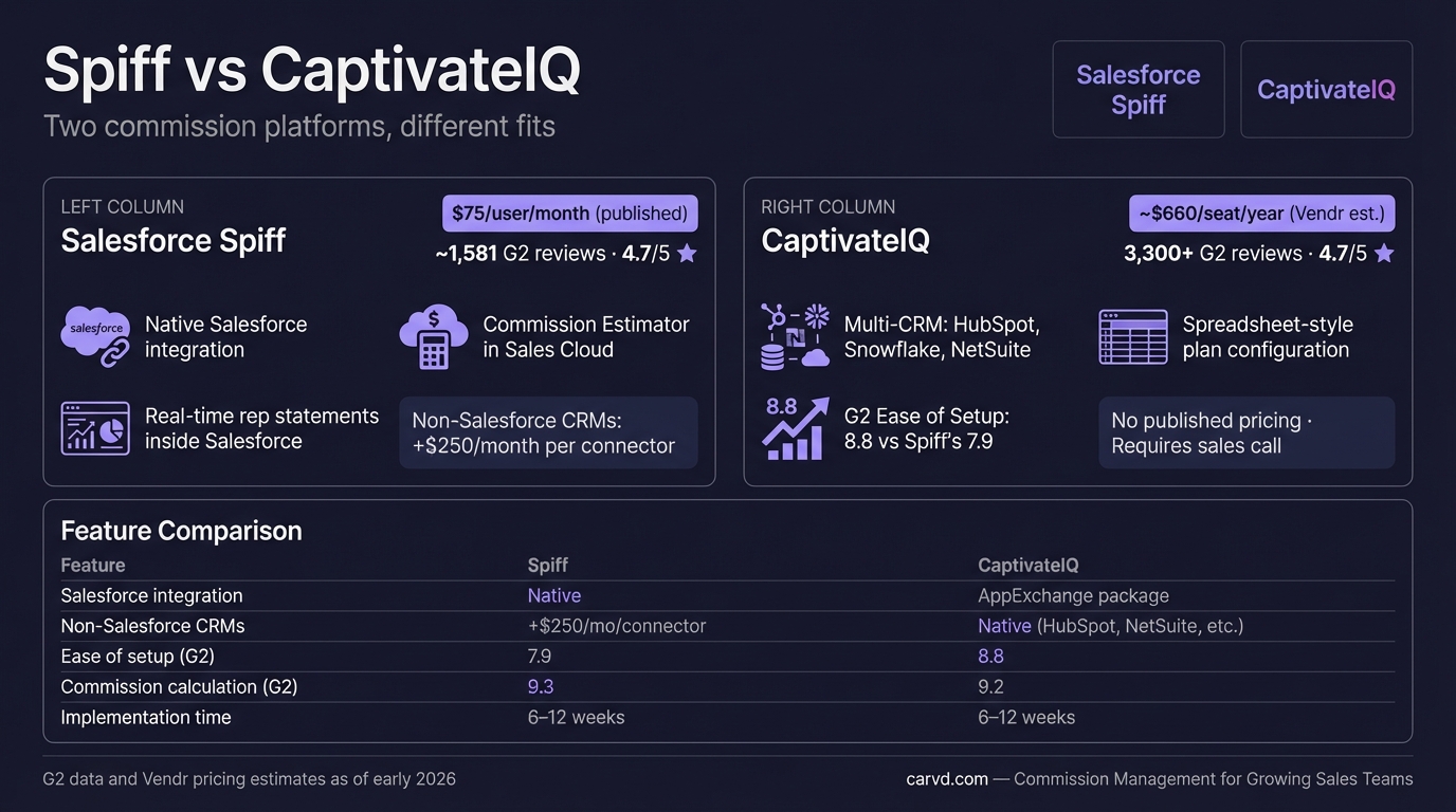 Salesforce Spiff is $75/user/month and runs natively inside Salesforce CRM. CaptivateIQ doesn't publish pricing — according to Vendr's procurement data (as of early 2026), it runs approximately $660/seat/year before integration and professional services costs. Both carry a 4.7/5 rating on G2. Both target mid-market and enterprise sales teams. And both require weeks of implementation before you're running live commission calculations.