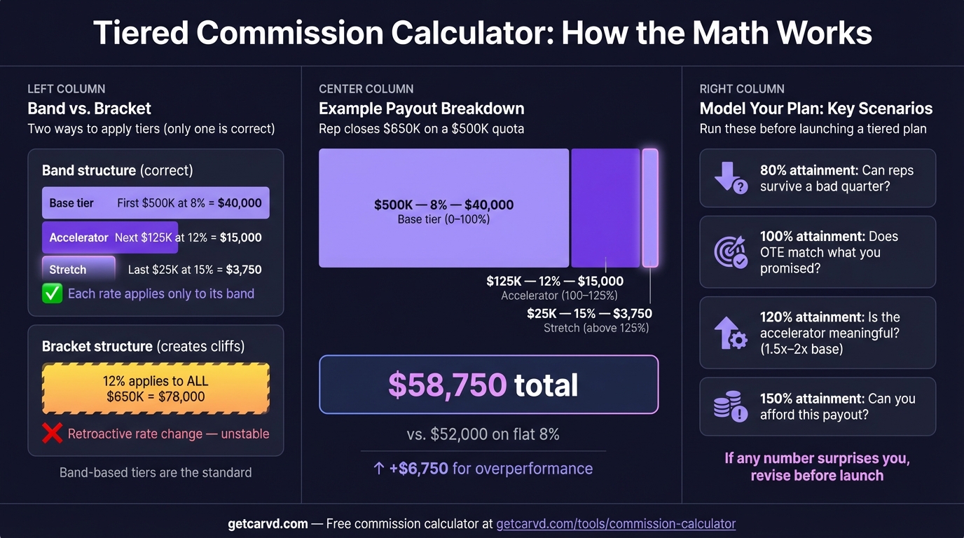 Calculate tiered commission payouts instantly. Includes step-by-step formulas for marginal tiers, quota-attainment brackets, and accelerator multipliers with worked examples.