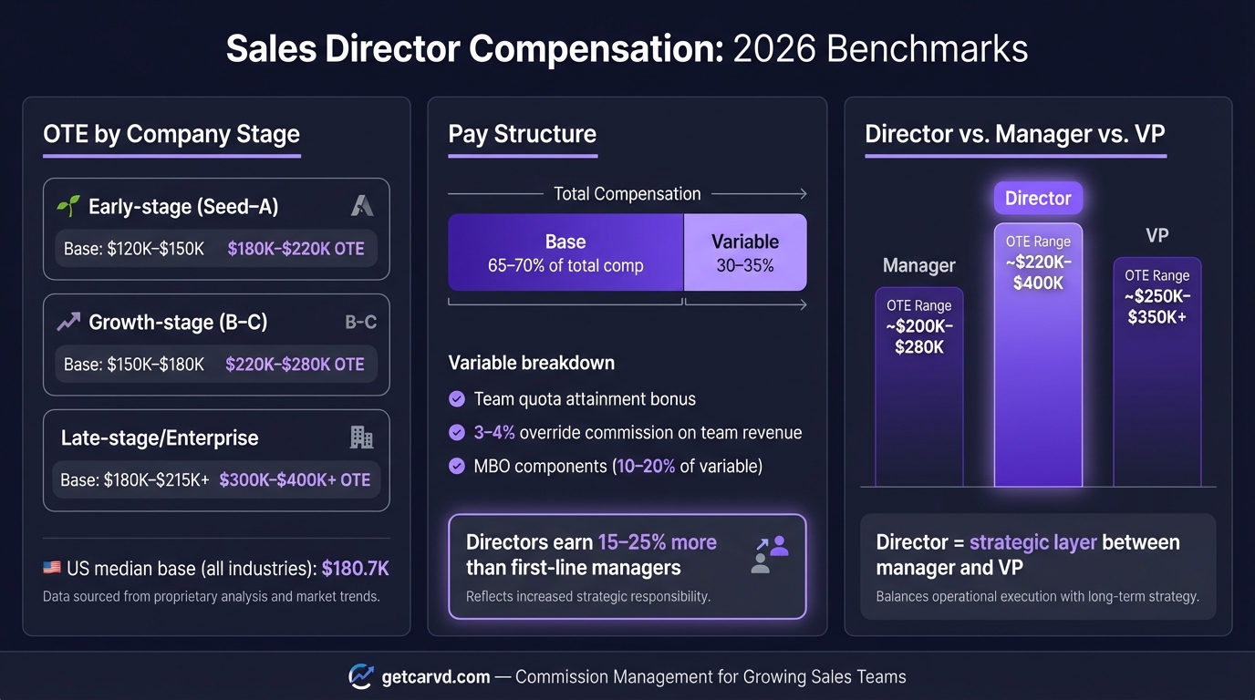 Sales director OTE ranges from $180K at early-stage startups to $400K+ at enterprise companies. Current benchmarks for base, variable pay mix, and comp plan structure.